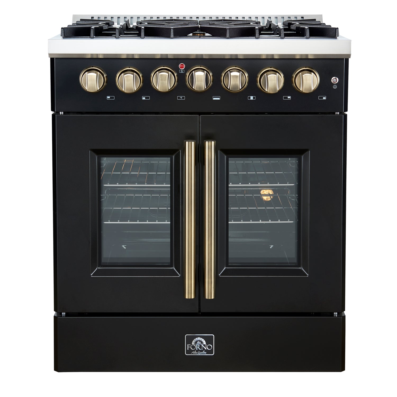FORNO Galiano 30" 4.32 cu. ft. French Door Dual Fuel Range with 5 Sealed Burners in Black with Antique Brass Accents, FFSGS6356-30BLK