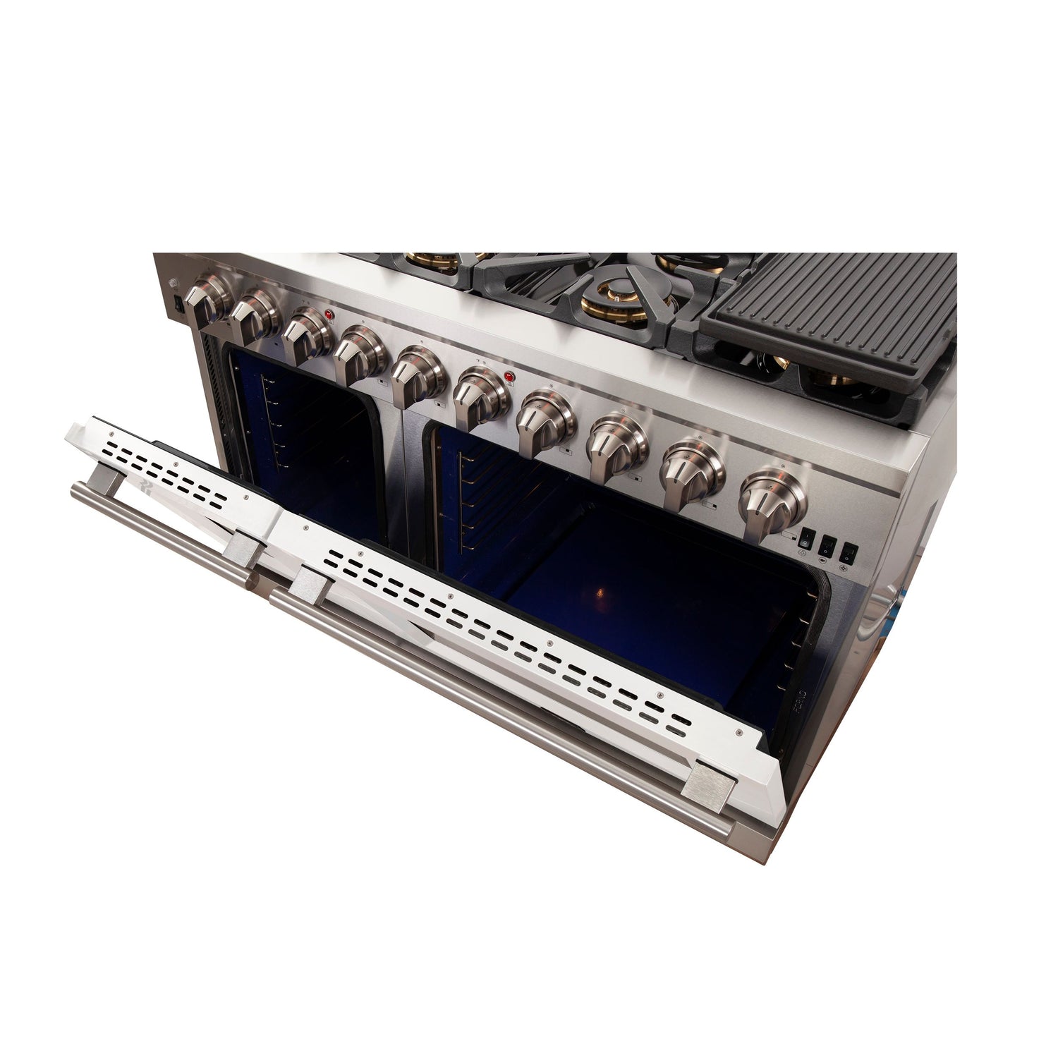 The Forno Capriasca 48 Inch Gas Range enhances your home kitchen with professional styling and performance through its durable and beautiful 304-grade stainless-steel design. The cooking surface features 8 sealed dual-ring brass burners, totaling 160,000 BTU. All burners, each at 20,000 BTU, can simmer precisely at 1,000 BTU. Continuous heavy-duty cast-iron grates facilitate easy sliding of pots or pans off heat over the enamel cooktop cavity, simplifying spill cleanup. The cumulative 6.58 cu. ft. double ovens, with a 44,000 BTU output, are enclosed in a blue enamel interior. The 4.32 cu.ft. main oven offers a powerful infrared mesh broiler, a rotisserie skewer and a convection fan for precise, and consistent cooking on multiple levels. The package includes 6 telescopic stainless-steel oven racks, 1 rotisserie kit, wok support, griddle and an LP conversion kit. Additionally, zinc-coated illuminated metal knobs with bezel rings ensure enduring beauty.