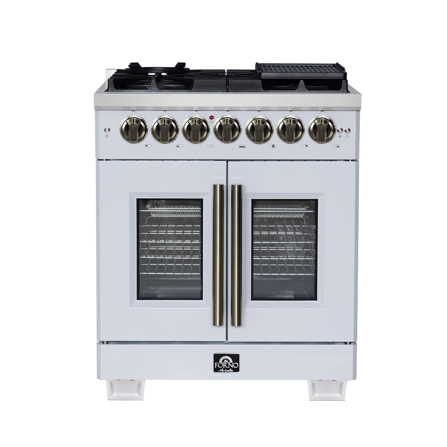 FORNO Capriasca 30" 4.32 cu. ft. French Door Dual Fuel Range with 5 Brass Burners, Air Fryer Kit, Rotisserie Kit, Wok Support & Griddle in White with Antique Brass Accents, FFSGS6387-30WHT