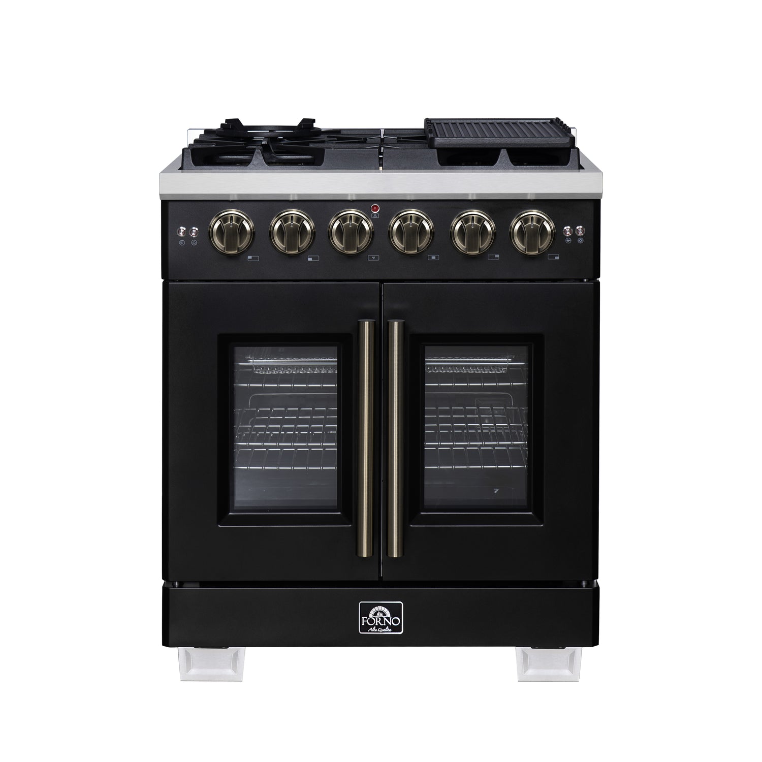 FORNO Capriasca 30" 4.32 cu. ft. French Door Gas Range with 5 Brass Burners, Air Fryer Kit, Rotisserie Kit, Wok Support & Griddle in Black with Antique Brass Accents, FFSGS6460-30BLK