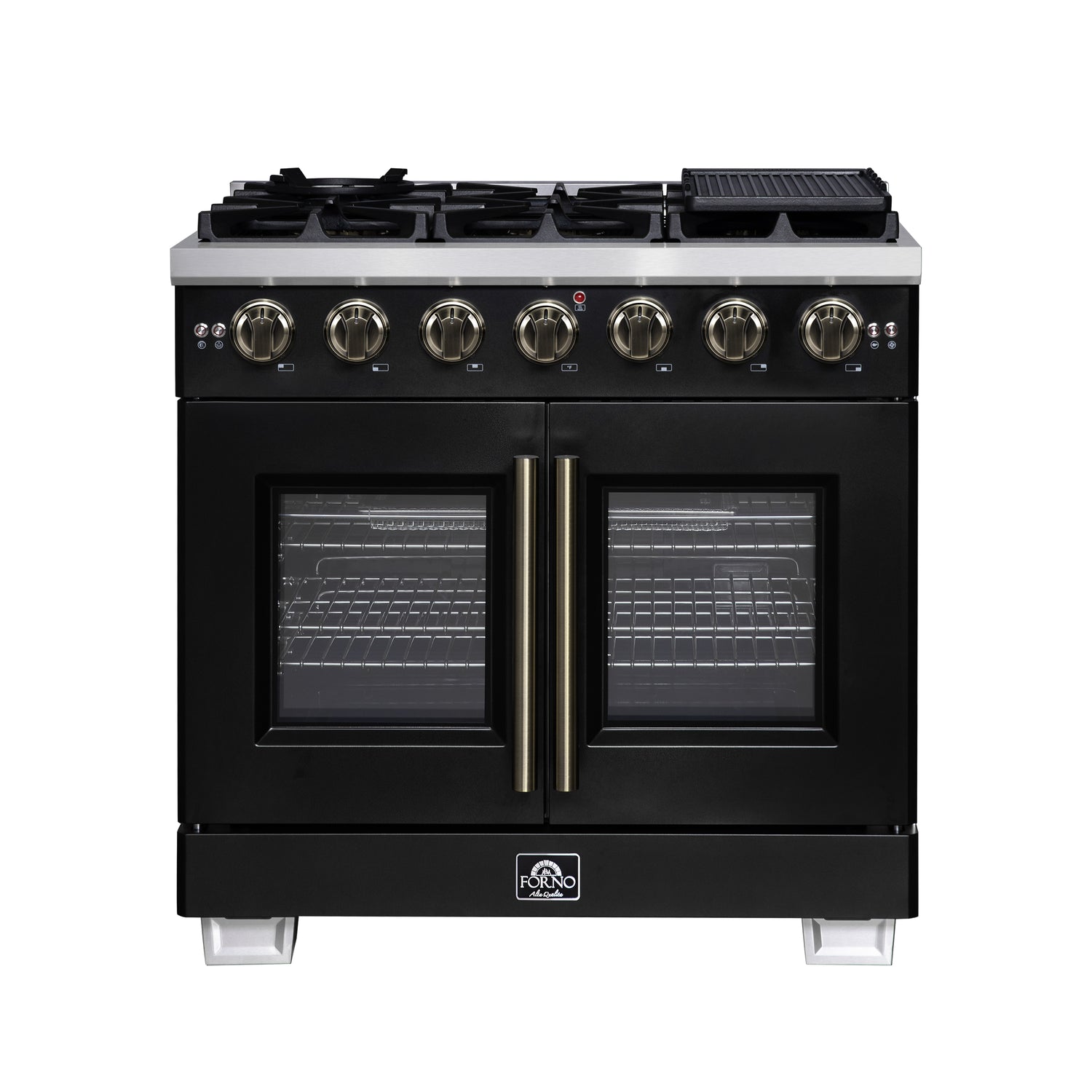 FORNO Capriasca 36" 5.36 cu. ft. French Door Gas Range with 6 Brass Burners, Air Fryer Kit, Rotisserie Kit, Wok Support & Griddle in Black with Antique Brass Accents, FFSGS6460-36BLK