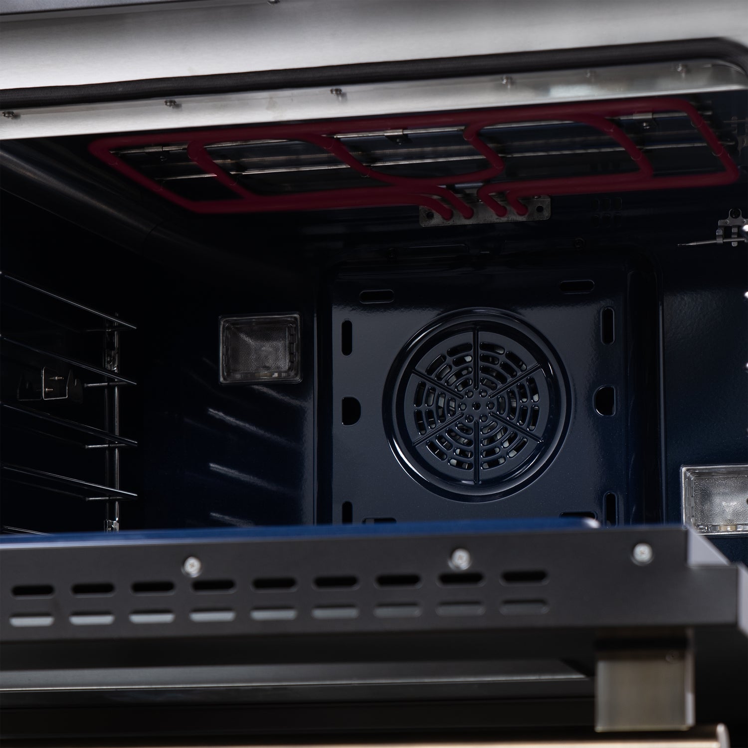 • 6.58 cu. ft. True Convection Oven: Dual ovens with durable speckled blue enamel interiors, triple-layer glass doors, and true convection in the right oven for consistent, even cooking.