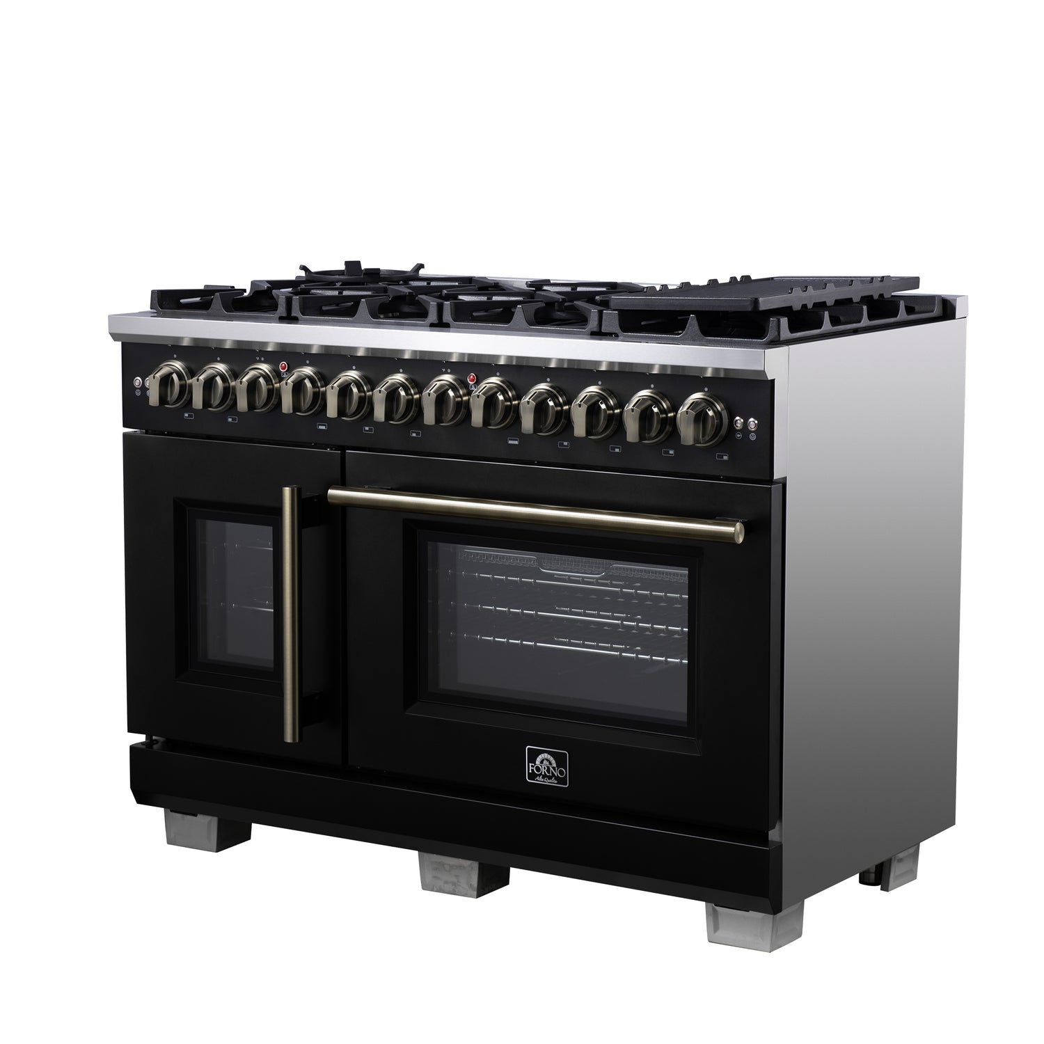 FORNO Capriasca 48" 6.58 cu. ft. Dual Fuel Range with 8 Brass Burners, Air Fryer Kit, Rotisserie Kit, Wok Support & Griddle in Black with Antique Brass Accents, FFSGS6387-48BLK