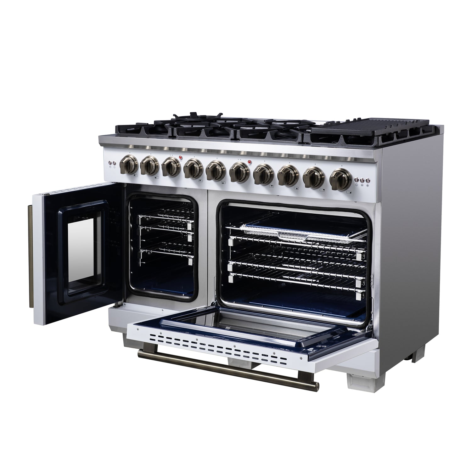 FORNO Capriasca 48" 6.58 cu. ft. French Door Gas Range with 8 Brass Burners, Air Fryer Kit, Rotisserie Kit, Wok Support & Griddle in White with Antique Brass Accents, FFSGS6460-48WHT