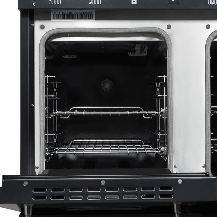 Bring style and power to your kitchen with the Forno Antico 48" Dual Fuel Range in black—where elegance meets exceptional performance. With 8 sealed burners and a total output of 94,000 BTU, it delivers the power and precision needed for any culinary challenge. The two dual-ring brass burners provide up to 20,000 BTU for high-heat searing and 1,000 BTU for simmering, delivering exceptional control. Its 3.5 cu.ft. convection oven and an additional 2 cu.ft. oven provide ample room for big family meals. The sleek black finish with antique brass accents exudes sophistication, while cast-iron grates ensure stability and durability, and recessed enamel cooktop makes cleanup effortless. This range seamlessly blends power, style, and dependable performance for an exceptional cooking experience all at an affordable price.