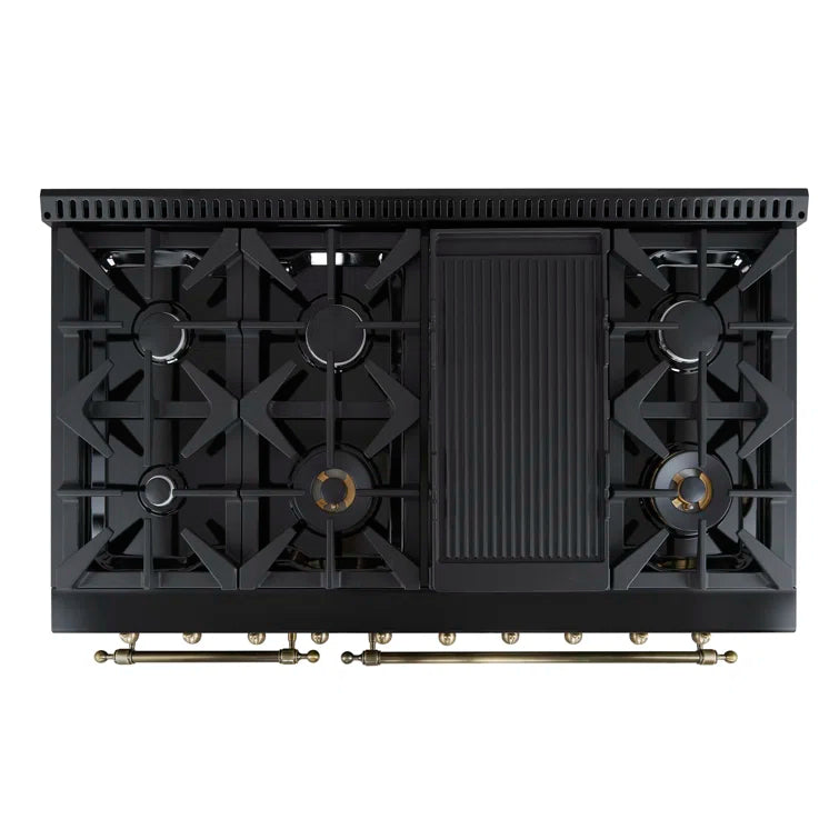 FORNO Antico 48" 5.5 cu. ft. Dual Fuel Range with 8 Sealed Burners and Griddle in Black with Antique Brass Accents, FFSGS6113-48BLK