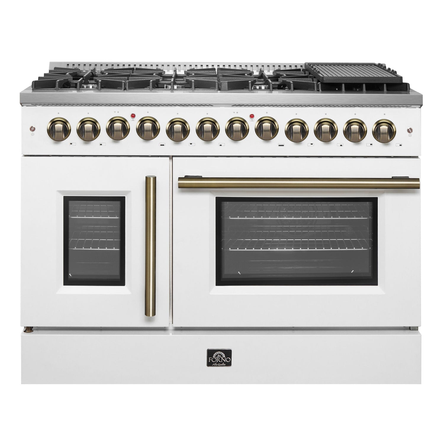 FORNO Galiano 48" 6.58 cu. ft. French Door Dual Fuel Range with 8 Sealed Burners and Griddle in White with Antique Brass Accents, FFSGS6356-48WHT