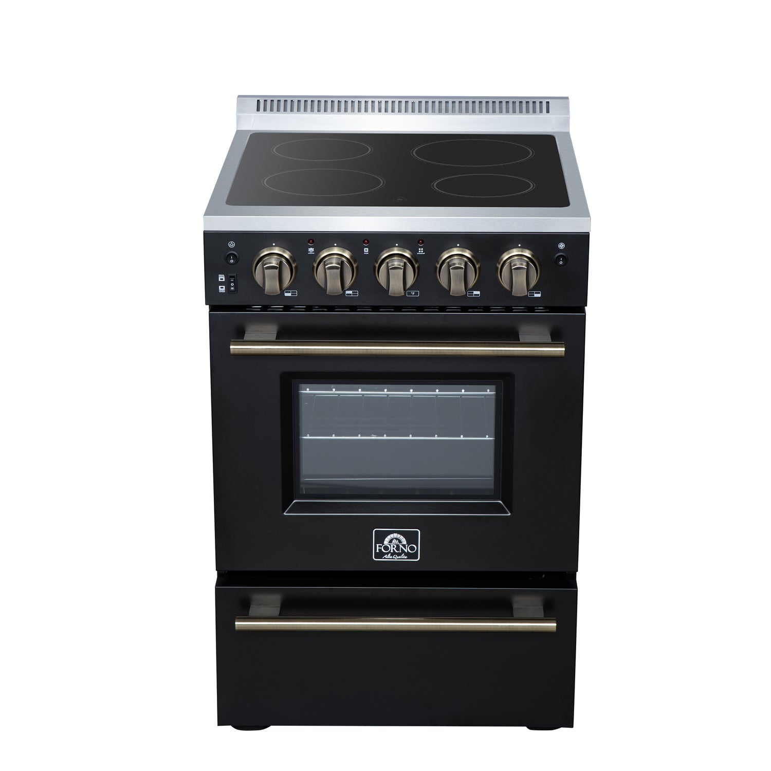 FORNO Loiano 24" 2.3 cu. ft. Freestanding Electric Range with 4 Element Burners, Storage Drawer and Air Fryer Kit in Black with Antique Brass Accents, FFSEL6069-24BLK
