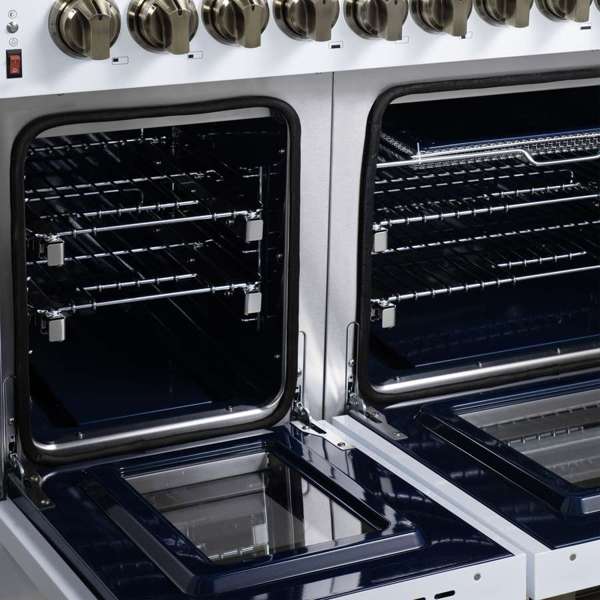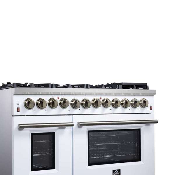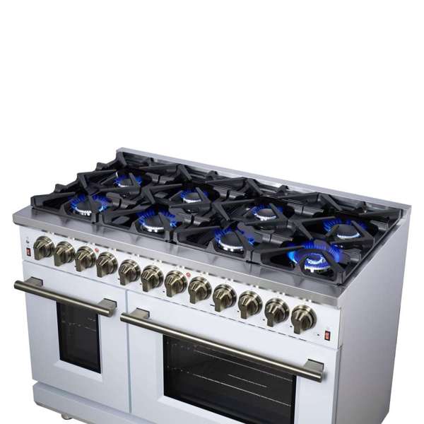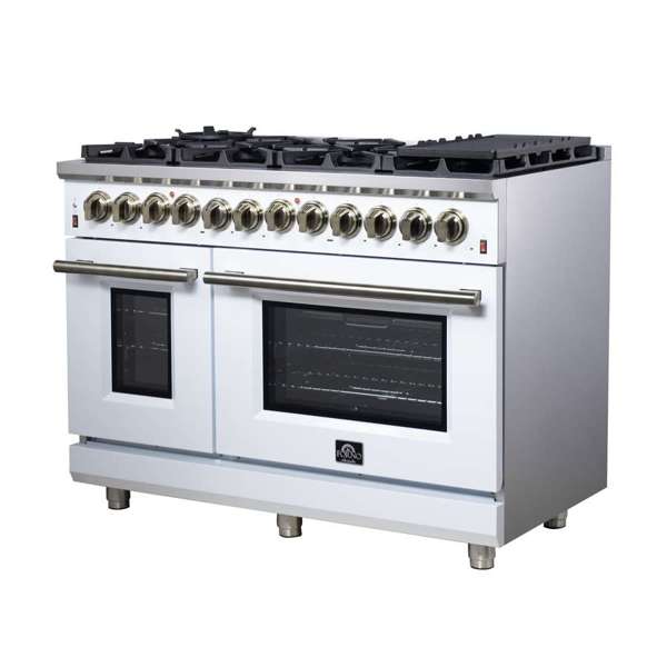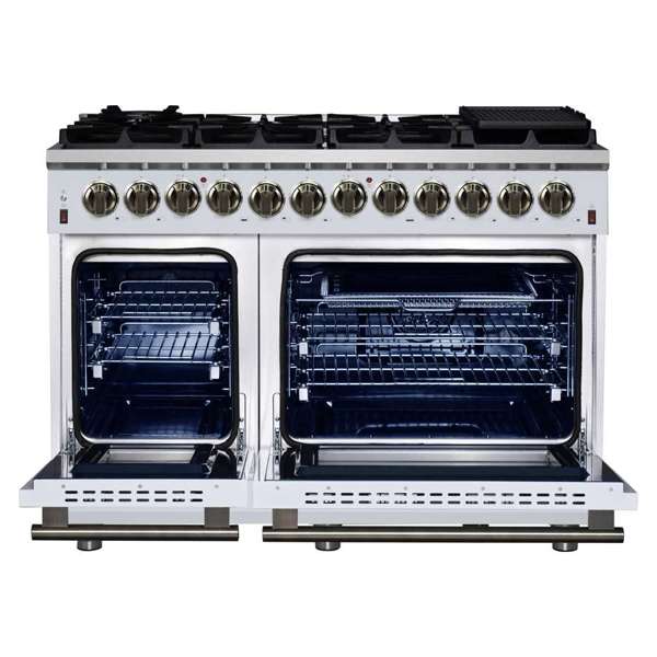 FORNO Massimo 48" 6.58 cu. ft. Freestanding Dual Fuel Range with 8 Sealed Burners, Air Fryer Kit, Wok Support & Griddle in White with Antique Brass Accents, FFSGS6125-48WHT