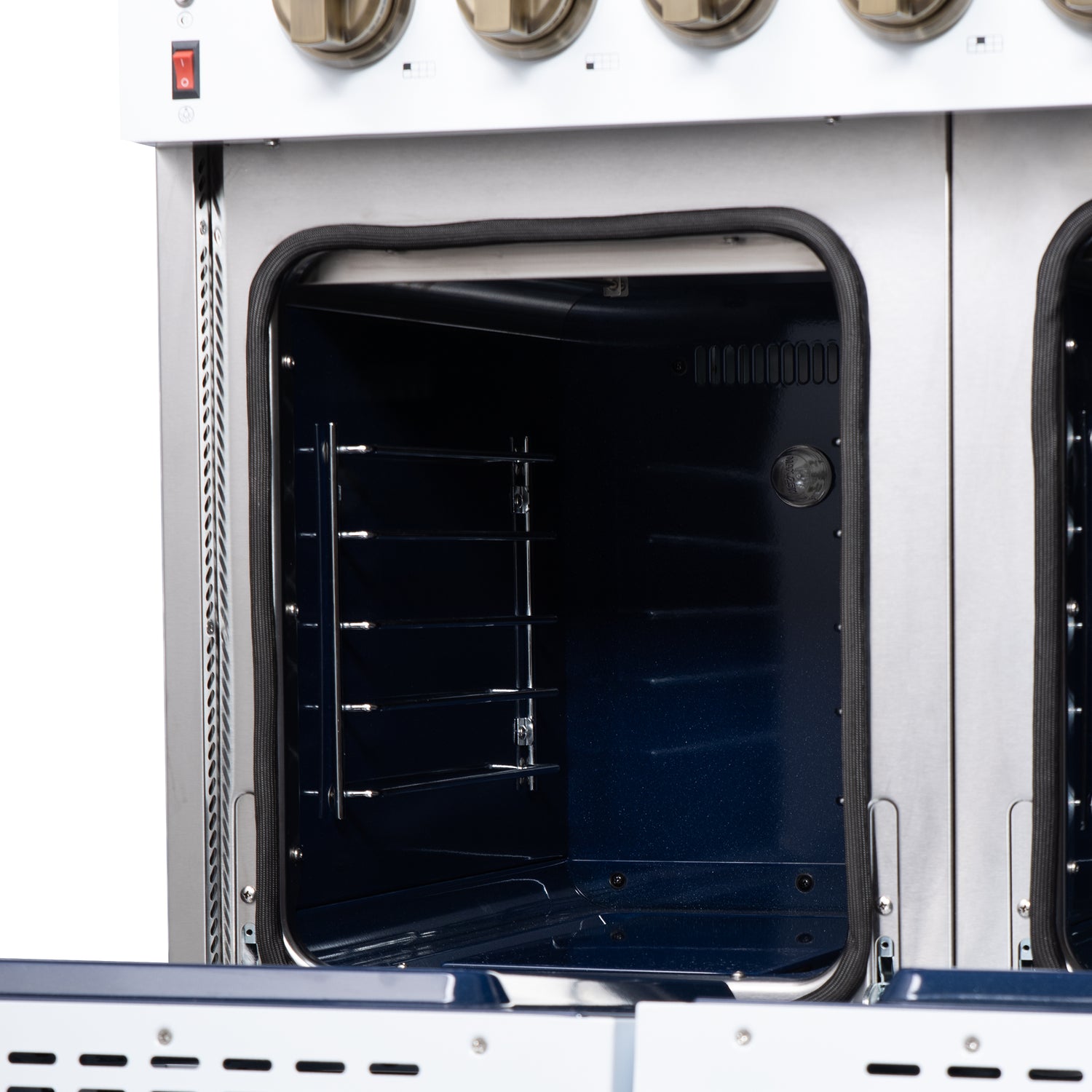 The Forno Massimo 48 Inch Gas Range in White harmonizes professional style and durability with Antique Brass. Its 8 sealed burners, totaling 107,000 BTU, include a precision 20,000 BTU dual-ring burner that can simmer at 1,000 BTU. Continuous cast iron grates ensure stability on the enamel surface. The main oven of 4.32 cu.ft. has a convection fan with 30,000 BTU total broil and bake output. The secondary oven has a capacity of 2.26 cu.ft. with a 14,000 BTU bake output. Both ovens feature impressive blue enamel interiors for easy cleaning, and 3-layer glass oven door windows provide heat retention and a clear view. It includes 2 telescopic racks per oven, an air fryer kit, a wok support, two reversible griddles, an LP conversion kit, and durable zinc-coated metal knobs. This range delivers performance, convenience, and enduring elegance.