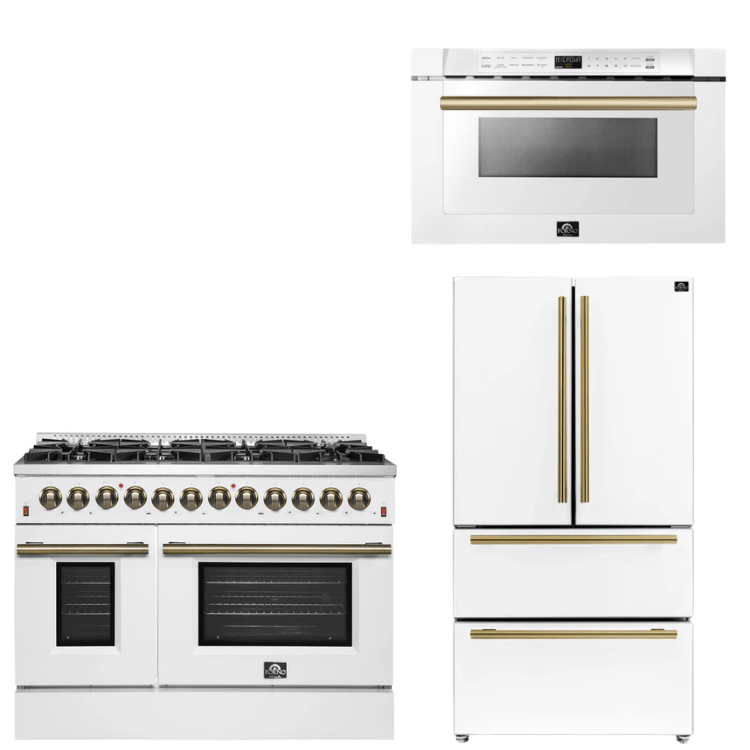 FORNO Appliance Package - 48" Dual Fuel Range, 36" Refrigerator, Microwave in White with Antique Brass Accents