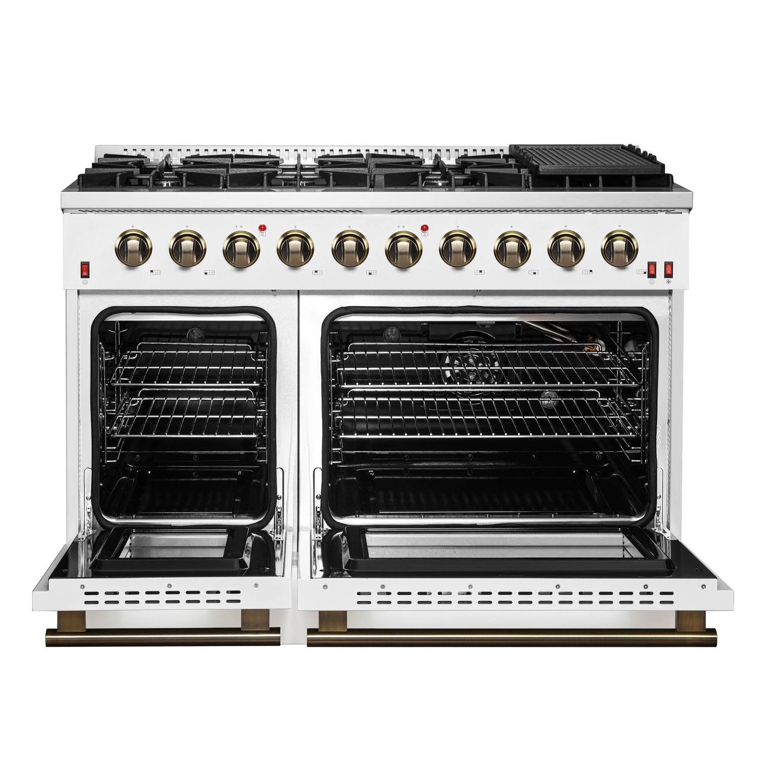FORNO Galiano 48" 6.58 cu. ft. Gas Range with 8 Sealed Burners and Griddle in White with Antique Brass Accents, FFSGS6244-48WHT