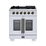 FORNO Capriasca 30" 4.32 cu. ft. French Door Gas Range with 5 Brass Burners, Air Fryer Kit, Rotisserie Kit, Wok Support & Griddle in White with Antique Brass Accents, FFSGS6460-30WHT