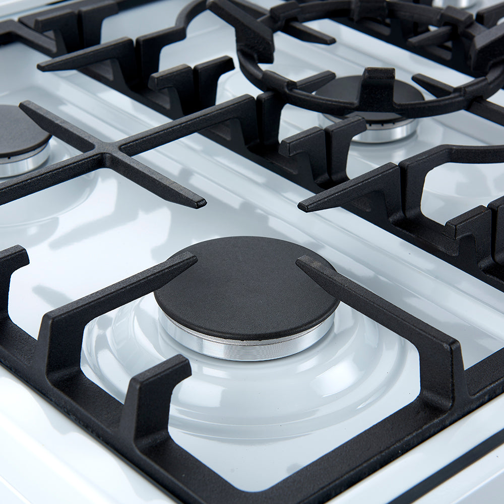 • Cast Iron Grates: Continuous cast iron grates provide secure stability and easy movement of cookware across the cooktop.