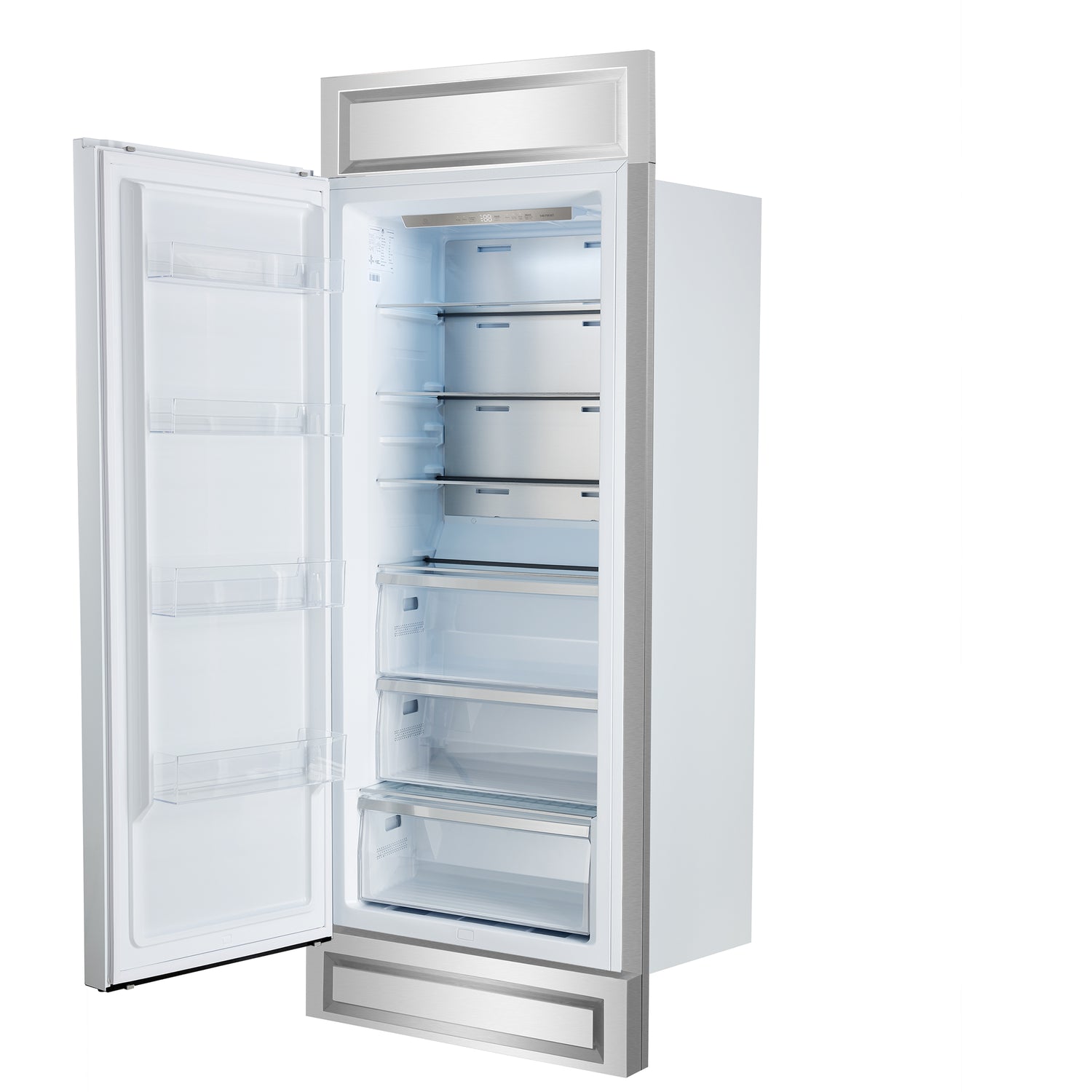 The Forno Maderno 28-inch refrigerator offers a built-in look with a decorative grill that extends its width to 32 inches, ensuring seamless kitchen integration. Available in white with elegant antique brass handles, it’s part of our refined Espresso line. With 13.6 cu.ft. of capacity and a Convertible Cooling Zone, it provides flexible storage and consistent performance. Total No-Frost Technology removes the need for manual defrosting, while the Metal Multi-Airflow system keeps groceries fresh. Inside, 3 glass shelves, 4 door bins, and 3 removable drawers with silver trims optimize organization. The swing door design, intuitive electronic touch control, VCM stainless steel doors, metal back panel, and Energy Star certification ensure convenience, durability, and efficiency for your home.