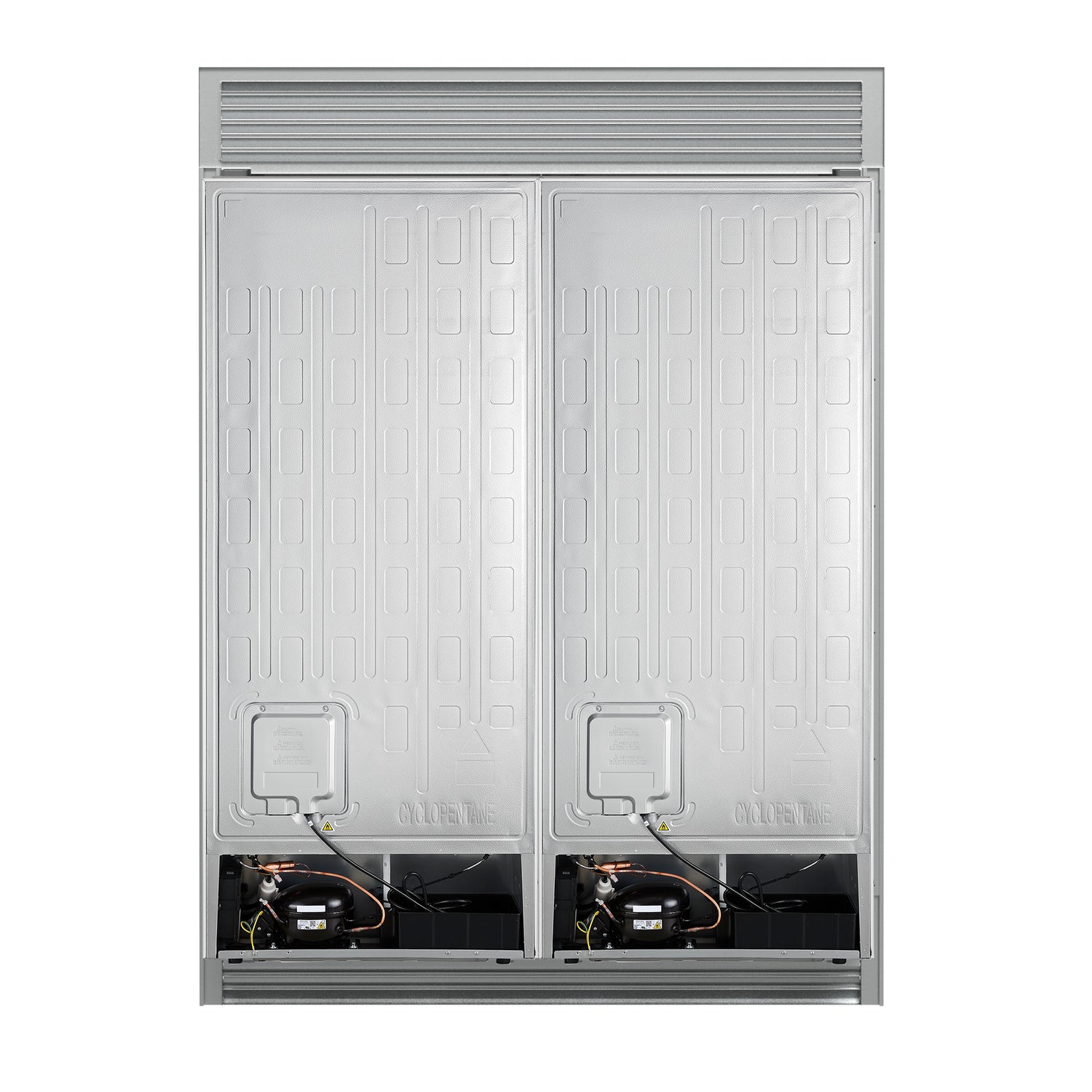 The FORNO Maderno Refrigerator and Freezer Combo brings together two 28-inch convertible units, seamlessly connected by a grill trim kit to form a stunning 60-inch built-in design. With a total capacity of 27.2 cu.ft., this unit offers exceptional versatility and spacious storage. Each side features independent temperature zones that can switch between refrigerator and freezer modes, giving you full control to suit your needs. Engineered with Total No Frost technology, the Maderno eliminates manual defrosting while maintaining ideal temperatures with dual inverter compressors. Interior LED lighting, sleek glass shelves with silver trim, and convenient plastic drawers enhance both function and style. With features like Super Cool and Super Freeze, quick temperature recovery is effortless- perfect for preserving freshness. All housed in a durable, fingerprint-resistant stainless-steel VCM panel, the Maderno is as efficient as it is elegant, complete with an E-Star energy rating and T Climate Class certification.