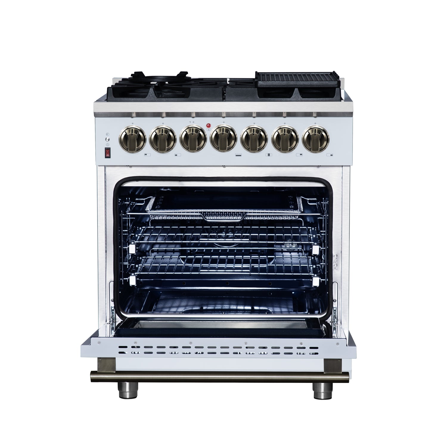 FORNO Massimo 30" 4.32 cu. ft. Freestanding Dual Fuel Range with 5 Sealed Burners, Air Fryer Kit, Wok Support & Griddle in White with Antique Brass Accents, FFSGS6125-30WHT