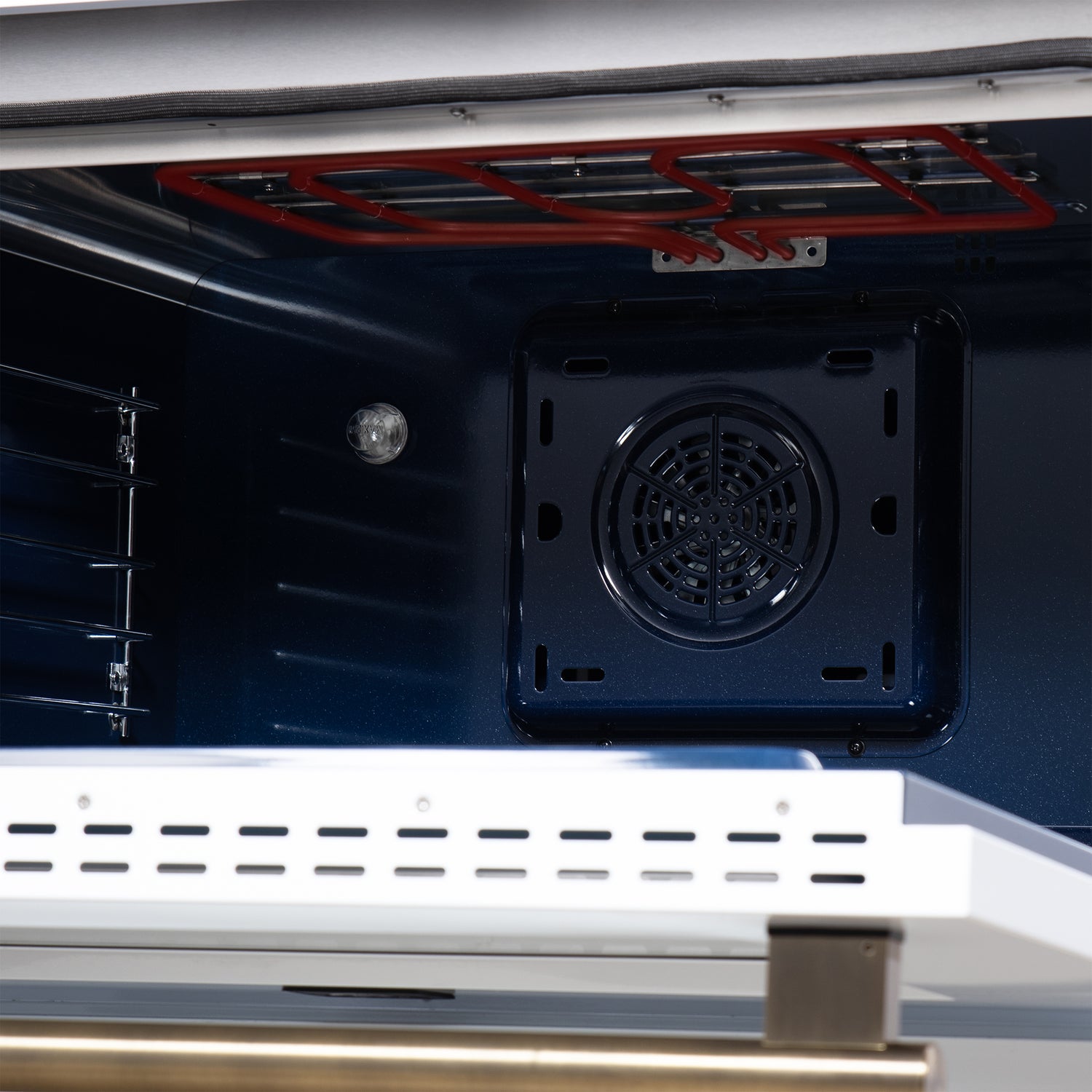 The Massimo 36 inch dual fuel range delivers powerful performance with refined style. It features six sealed gas burners and matte cast iron grates, plus included accessories like a wok ring and removable griddle. The 5.36 cu. ft. electric oven offers true convection cooking, dual-element broiling, and five baking modes for maximum versatility. Designed in a sleek white finish with antique brass handles, this range includes a built-in air fryer basket, steam-clean oven, and a speckled blue enamel interior. LP gas convertible and suitable for both freestanding or built-in installations.