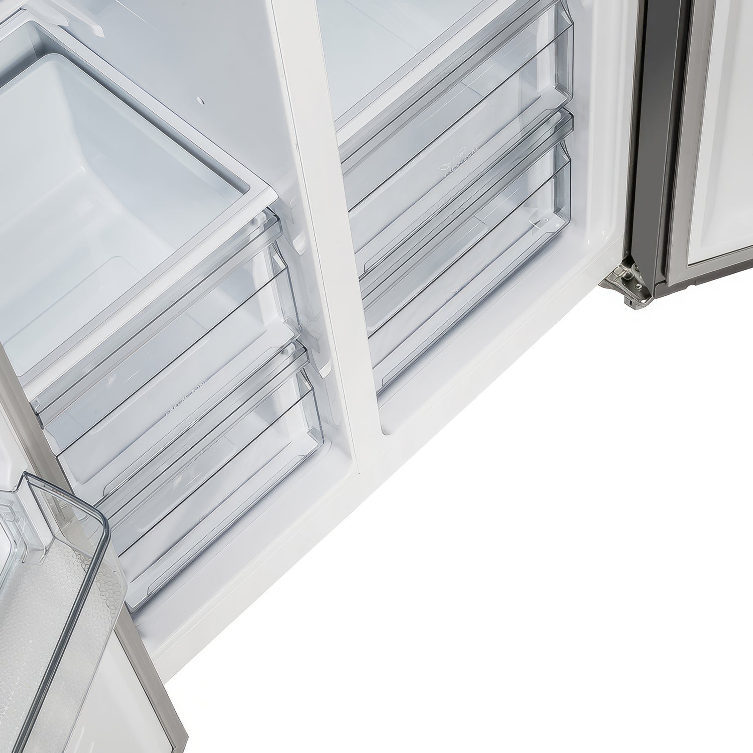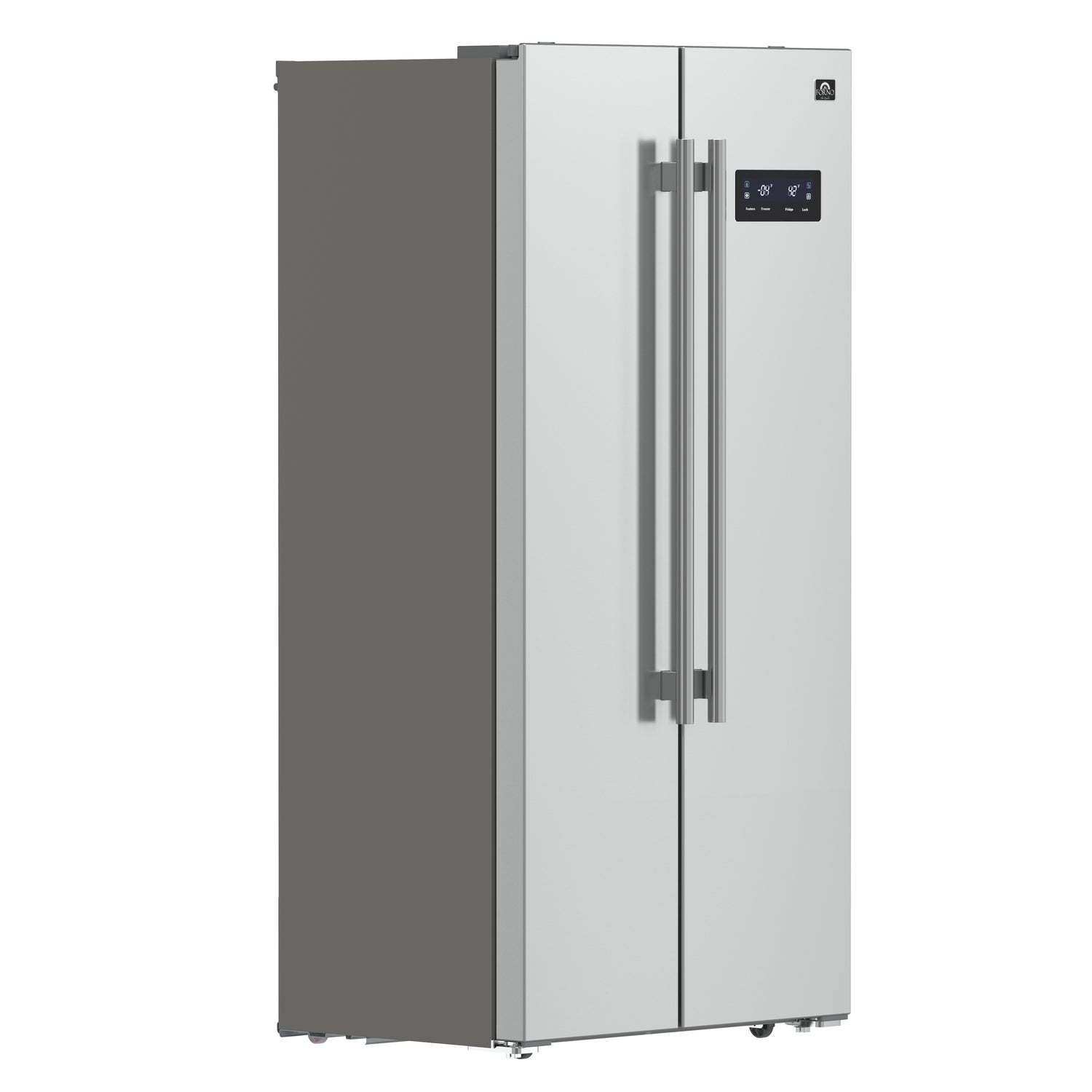This 33" Side-by-Side Refrigerator by Forno comes with 9.54 cu. ft. of refrigerator capacity and 6.08 cu. ft. of freezer capacity. The refrigerator also features LED lighting, electronic LED display on door and door opening alarm.