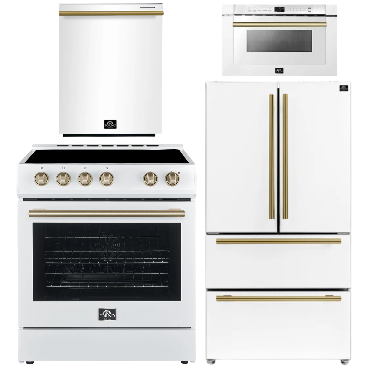 FORNO Espresso Package - 30" Electric Range, 36" Refrigerator with Ice Maker, Dishwasher and 24" Microwave Drawer in Whitewith Antique Brass Accents