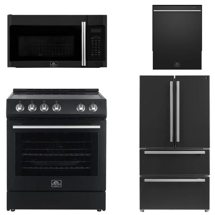 FORNO Espresso Package - 30" Electric Range, Over-The-Range Microwave, 36" Refrigerator with Ice Maker and Dishwasher in Black with Silver Accents, AP4-6012BLK-S12