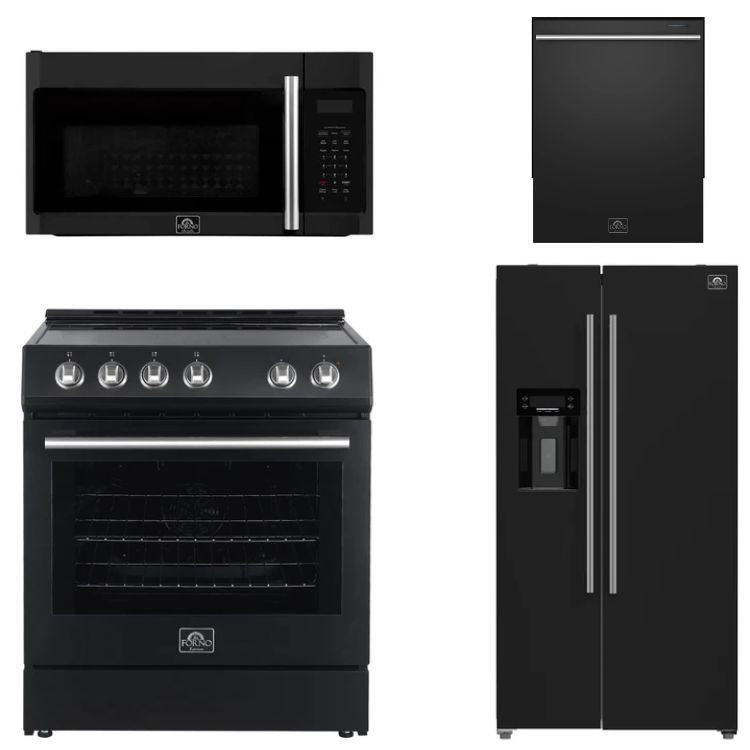 FORNO Espresso Package - 30" Electric Range, Over-The-Range Microwave, 36" Refrigerator with Water Dispenser/Ice Maker and Dishwasher in Black with Silver Accents, AP4-6012BLK-S14