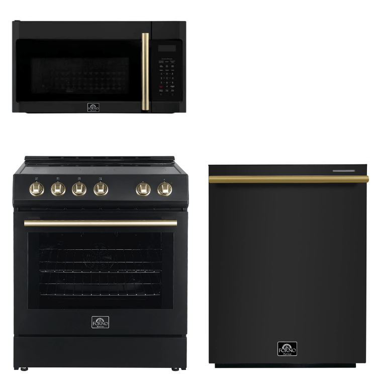 FORNO Espresso Package - 30" Electric Range, Over-The-Range Microwave and Dishwasher in Black with Antique Brass Accents, AP3-6012BLK-A10