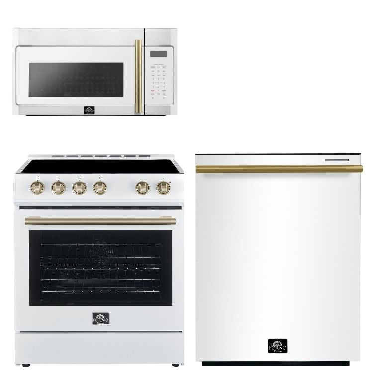 FORNO Espresso Package - 30" Electric Range, Over-The-Range Microwave and Dishwasher in White with Antique Brass Accents, AP3-6012WHT-A10