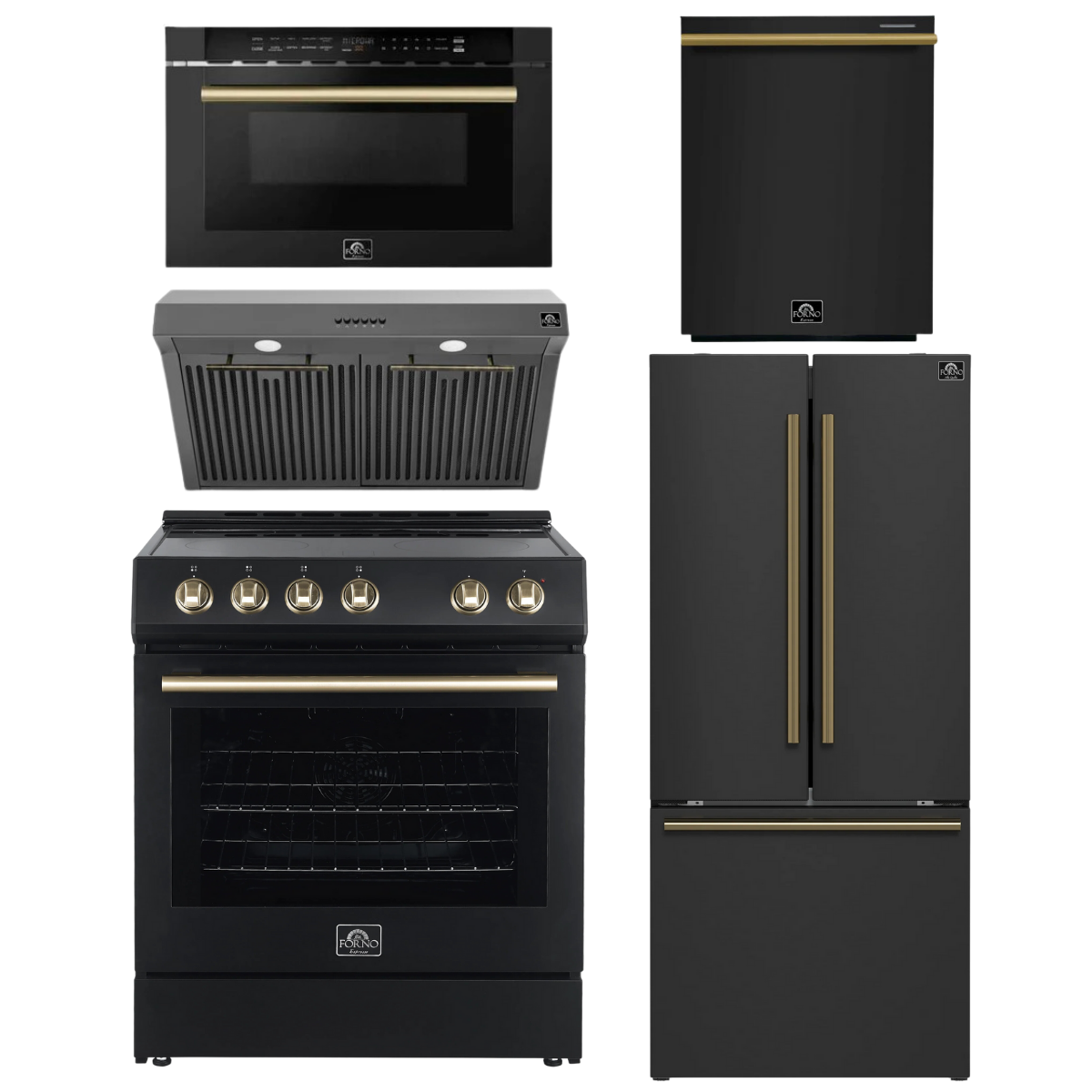 FORNO Espresso Package - 30" Electric Range, Range Hood, 30" Refrigerator with Ice Maker, Dishwasher and 24" Microwave Drawer in Black with Antique Brass Accents