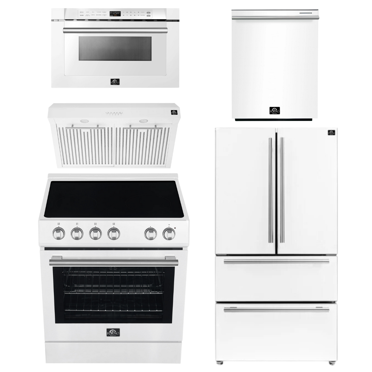 FORNO Espresso Package - 30" Electric Range, Range Hood, 36" Refrigerator with Ice Maker, Dishwasher and 24" Microwave Drawer in White with Silver Accents