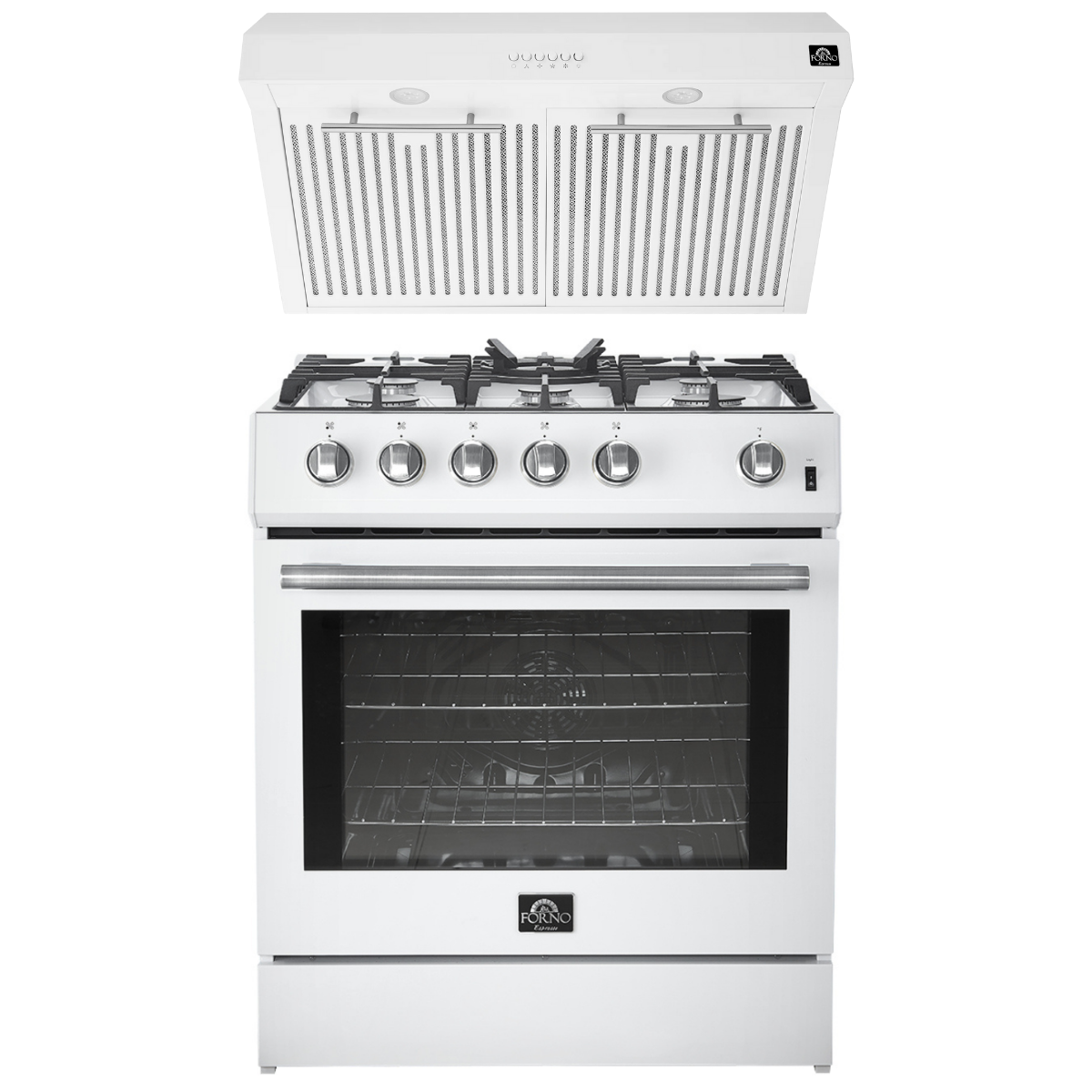 FORNO Espresso Package - 30" Gas Range and Under Cabinet Range Hood in White with Silver Accents