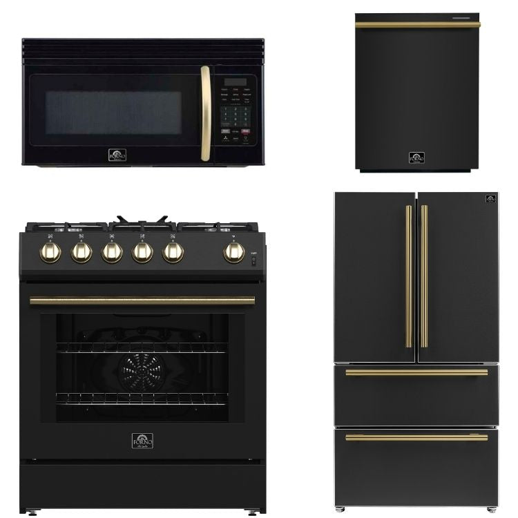 FORNO Espresso Package - 30" Gas Range, Over-The-Range Microwave, 36" Refrigerator with Ice Maker and Dishwasher in Black with Antique Brass Accents, AP4-1116BLK-A9