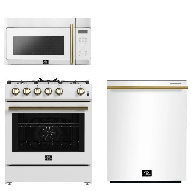 FORNO Espresso Package - 30" Gas Range, Over-The-Range Microwave and Dishwasher in White with Antique Brass Accents, AP3-1116WHT-A10