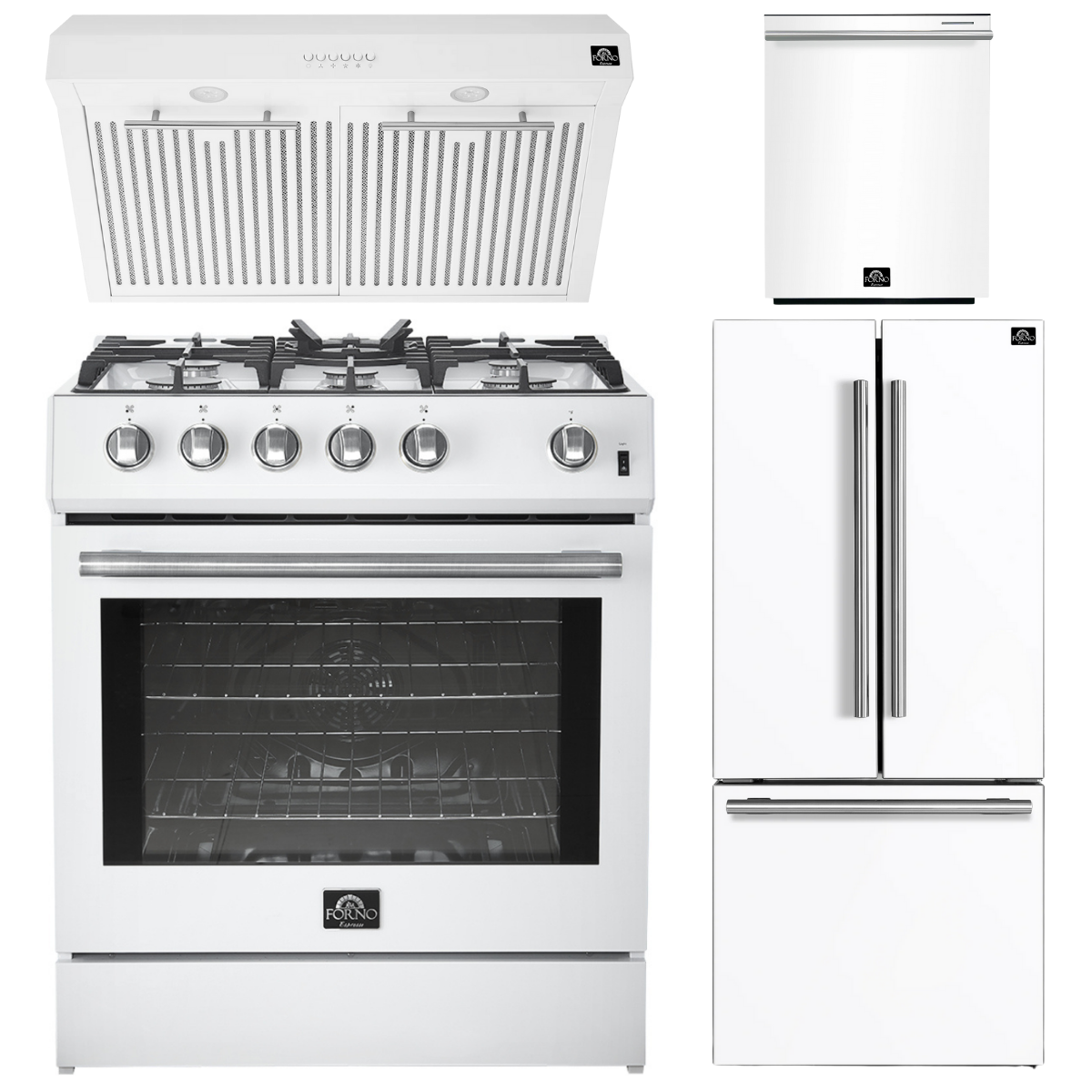FORNO Espresso Package - 30" Gas Range, Range Hood, 30" Refrigerator with Ice Maker and Dishwasher in White with Silver Accents