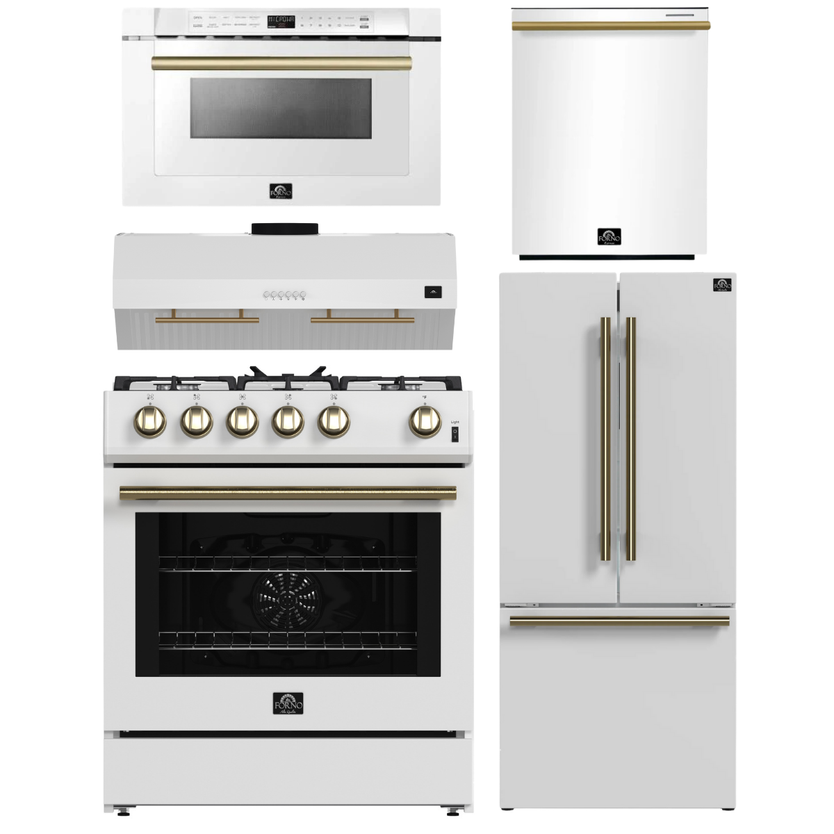 FORNO Espresso Package - 30" Gas Range, Range Hood, 30" Refrigerator with Ice Maker, Dishwasher and 24" Microwave Drawer in White with Antique Brass Accents