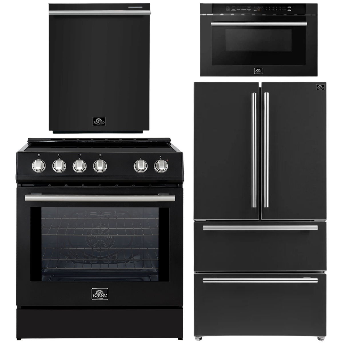 FORNO Espresso Package - 30" Induction Range, 36" Refrigerator with Ice Maker, Dishwasher and 24" Microwave Drawer in Black with Silver Accents