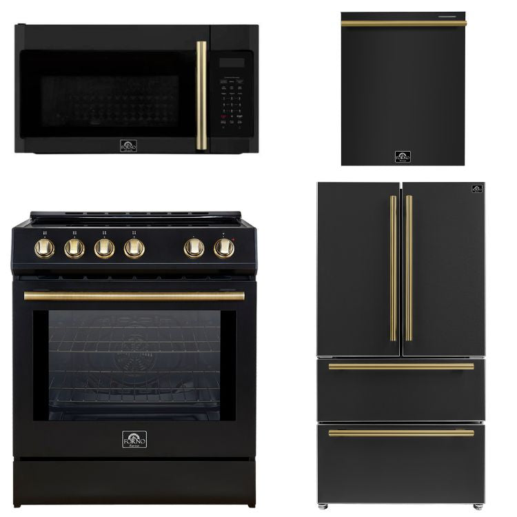 FORNO Espresso Package - 30" Induction Range, Over-The-Range Microwave, 36" Refrigerator with Ice Maker and Dishwasher in Black with Antique Brass Accents, AP4-0982BLK-A12