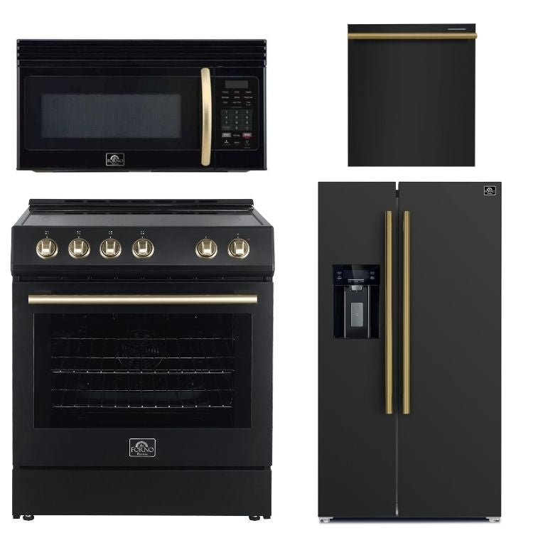FORNO Espresso Package - 30" Induction Range, Over-The-Range Microwave, 36" Refrigerator with Water Dispenser/Ice Maker and Dishwasher in Black with Antique Brass Accents, AP4-0982BLK-A11
