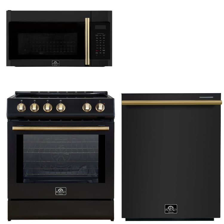 FORNO Espresso Package - 30" Induction Range, Over-The-Range Microwave and Dishwasher in Black with Antique Brass Accents, AP3-0982BLK-A10