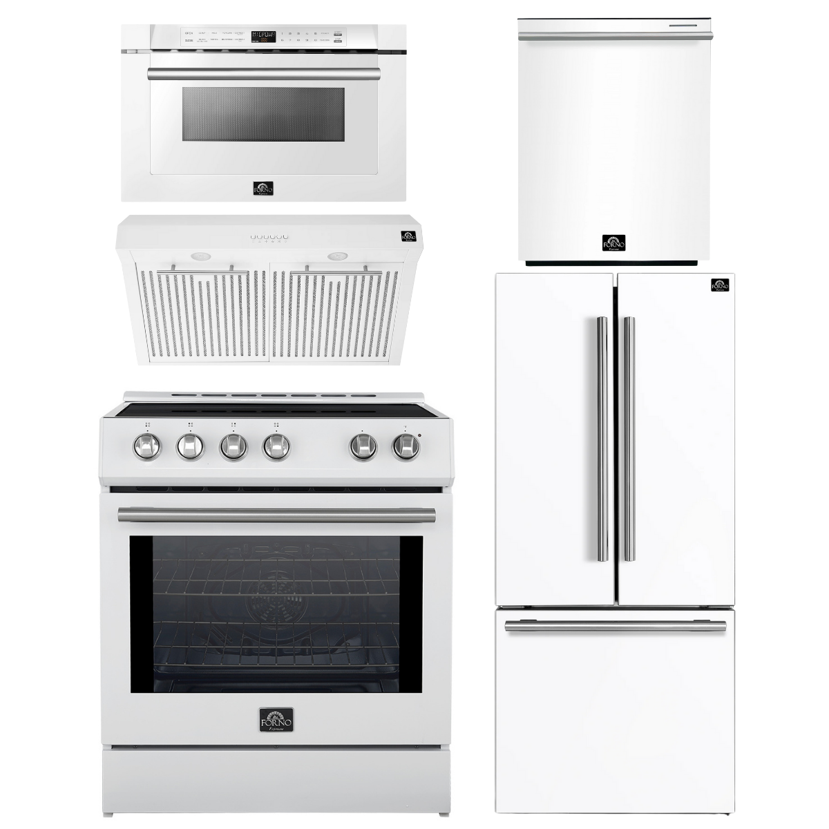 FORNO Espresso Package - 30" Induction Range, Range Hood, 30" Refrigerator with Ice Maker, Dishwasher and 24" Microwave Drawer in White with Silver Accents