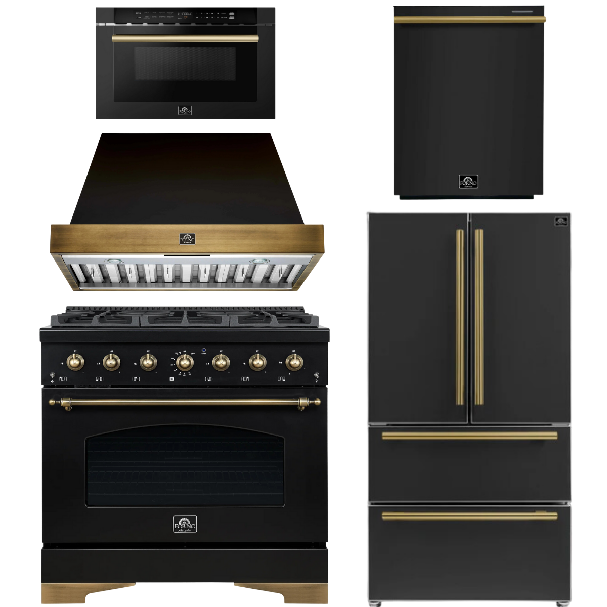 FORNO Antico Package - 36" Dual Fuel Range, Range Hood, 36" Refrigerator with Ice Maker, Dishwasher and 24" Microwave Drawer in Black with Antique Brass Accents