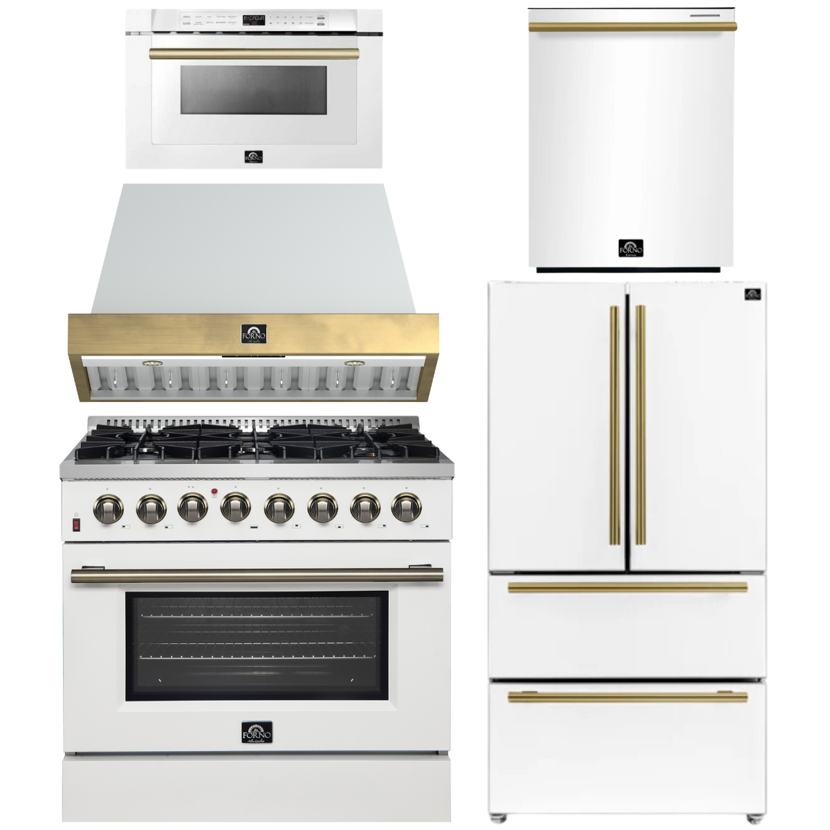 FORNO Galiano Package - 36" Dual Fuel Range, Range Hood, 36" Refrigerator with Ice Maker, Dishwasher and 24" Microwave Drawer in White with Antique Brass Accents