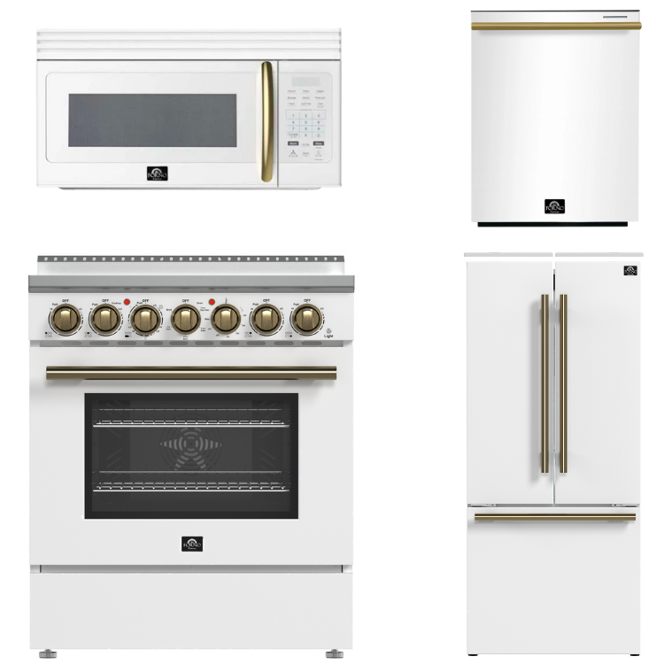 FORNO Paolo Package - 30" Electric Range, Over-The-Range Microwave, 30" Refrigerator with Ice Maker and Dishwasher in White with Antique Brass Accents, AP4-6011WHT-A10