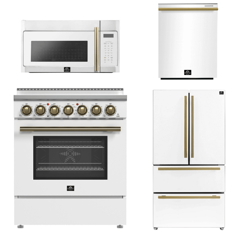 FORNO Paolo Package - 30" Electric Range, Over-The-Range Microwave, 36" Refrigerator with Ice Maker and Dishwasher in White with Antique Brass Accents, AP4-6011WHT-A12