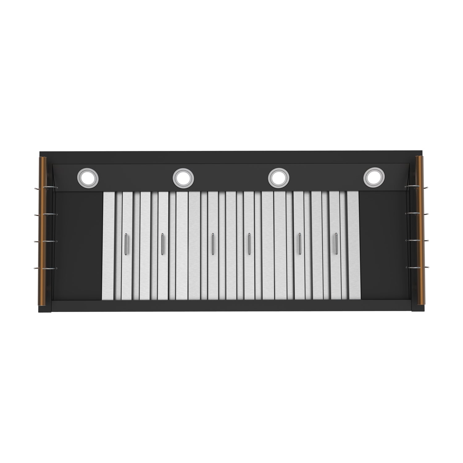 The Forno Venezia 48" Wall-Mounted Range Hood in Black with Antique Brass accessories delivers powerful ventilation and modern control in a bold, contemporary design. Three fan speeds handle everything from gentle simmering to high-heat cooking, while touch controls and a delay shut-off keep air moving to clear lingering smoke and odors. An adjustable-height chimney adapts to your ceiling, and dishwasher-safe baffle filters simplify cleanup. Energy-efficient LED lighting brightens the cooktop, pairing performance with striking style for any kitchen setup.