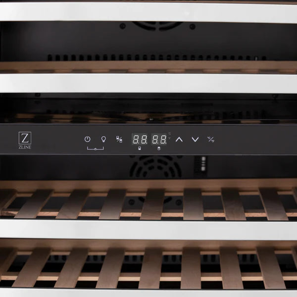 The ZLINE 24" Dual Zone 44-Bottle Wine Cooler in Stainless Steel and Gold Accents with Wood Shelf provides a premium entertainment experience by pairing unmatched cooling technology with luxurious style. Achieve ZLINE Attainable Luxury® excellence with innovative technology designed to enhance your kitchens capability.