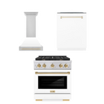 ZLINE Autograph Package - 30 In. Gas Range, Range Hood, Dishwasher in White Matte with Gold Accents, 3AKP-RGWMRHDWM30-G