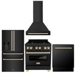ZLINE Autograph Package - 30" Dual Fuel Range, Range Hood, Refrigerator, Dishwasher in Black Stainless with Gold Accents