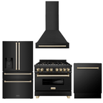 ZLINE Autograph Package - 36" Dual Fuel Range, Range Hood, Refrigerator with Water & Ice Dispenser, Dishwasher in Black Stainless, Gold Accents