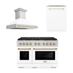 ZLINE Autograph Package - 48" Gas Range, Range Hood, and Dishwasher in White Matte and Satin Stainless Steel with Gold Accents, 3AKPR-RGSWMRHDWM48-G
